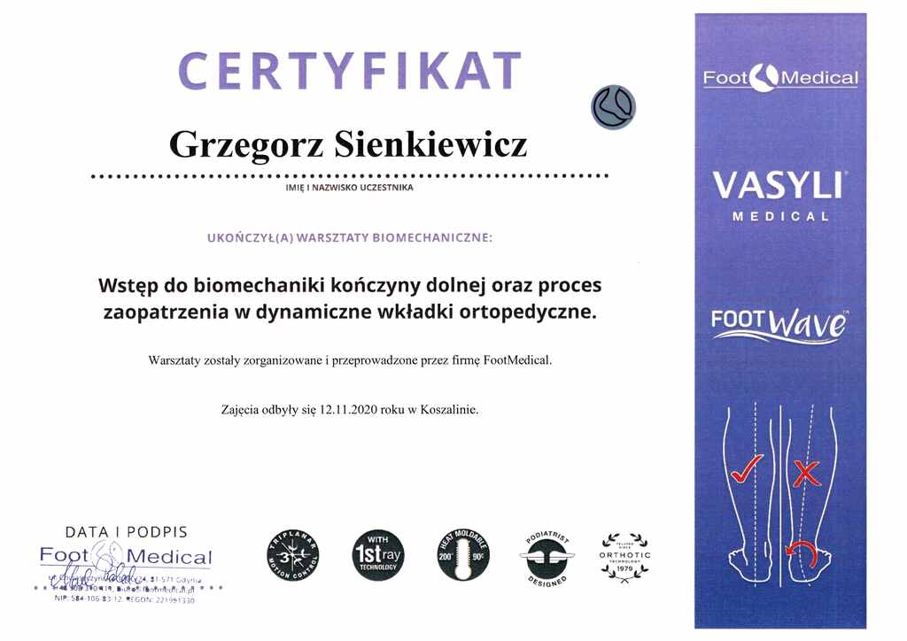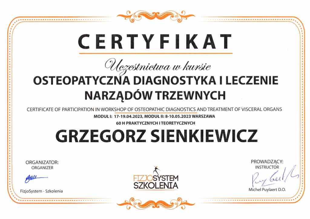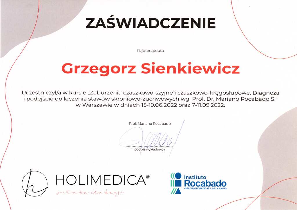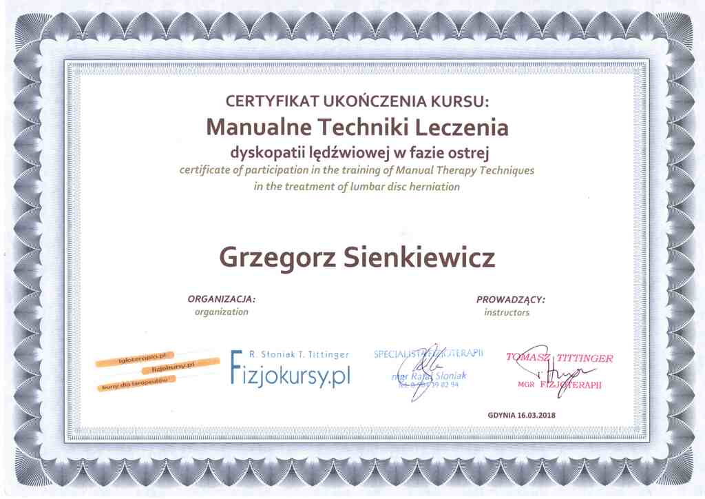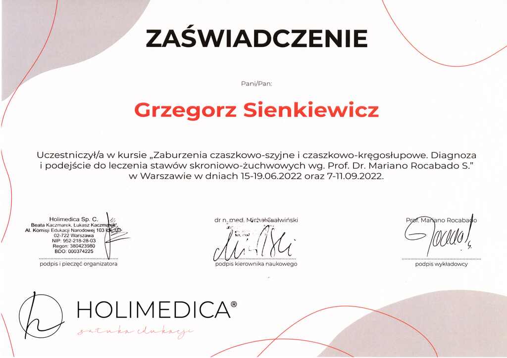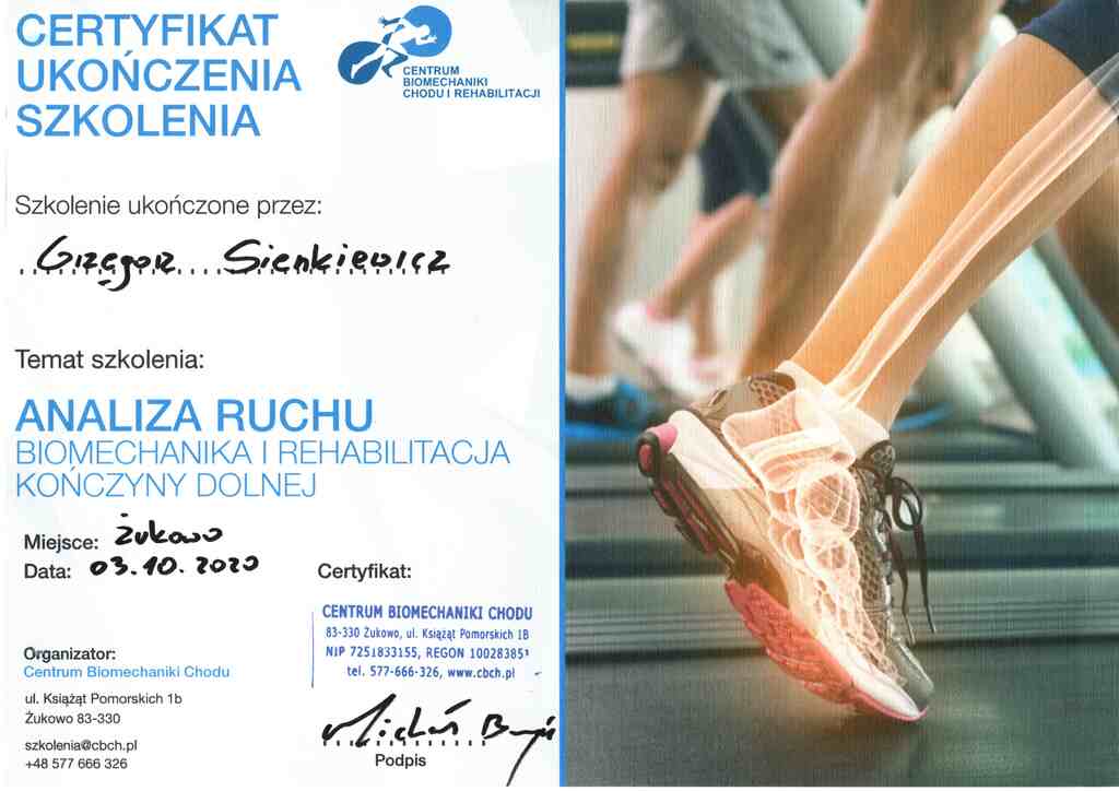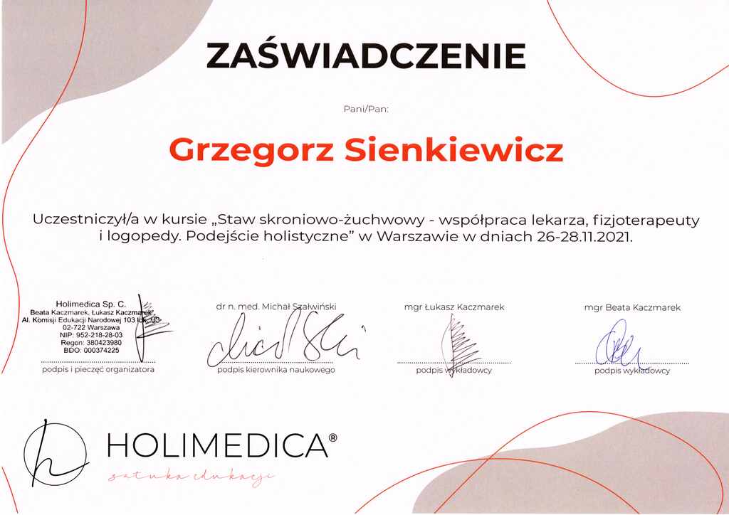 Absolwent Społecznej Akademii Nauk w nieistniejącym już oddziale w Kołobrzegu. Przed rozpoczęciem studiów Grzegorz ukończył studium na profilu Technik Masażysta, gdzie uzyskał uprawienia do pracy w zawodzie masażysty. Przygoda z jego pasją zaczęła się w Unitralu (aktualnie Hotele Nadmorskie), gdzie pracował jako masażysta w dziale rehabilitacji. W międzyczasie podjął współpracę z miejscowym klubem sportowym Gwardia Koszalin wspierając piłkarzy na boisku, jak i w trakcie treningów przez 4 lata. Swój pierwszy gabinet otworzył po zakończeniu pamiętnego Lockdownu spowodowanego pandemią Covid-19, tj. 11 kwietnia 2020r, w którym przyjmował pacjentów do sierpnia 2022r. W sezonie 2022/2023 był fizjoterapeutą w MKKS Żak Koszalin. Przygodę z terapią Stawów Skroniowo Żuchwowych zaczął w 2020r. i od tamtej pory jasno określił cel swojej specjalizacji – Fizjoterapia Stomatologiczna. Dziś współpracuję z wieloma Koszalińskimi (i nie tylko) lekarzami ortodontami, chirurgami szczękowymi, stomatologami, logopedami i neurologami wspomagając leczenie o fizjoterapie stomatologiczną.